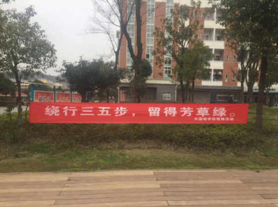 二是以“绕行三五步,留得芳草绿”为主题的校园环境保护活动。分团委组织公司各班团支部到一食堂广场,通过展示横幅、宣讲等方式呼吁同学们爱护校园环境,不要随意践踏草坪。只要同学们都自觉“绕行三五步”,为校园环境出一份力,便可少一个足迹多一份绿意,换来美丽舒适的校园。