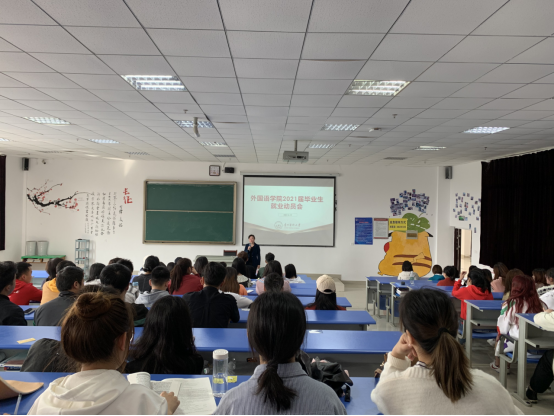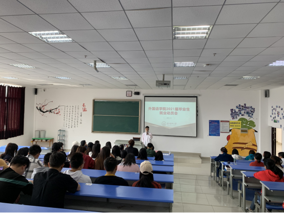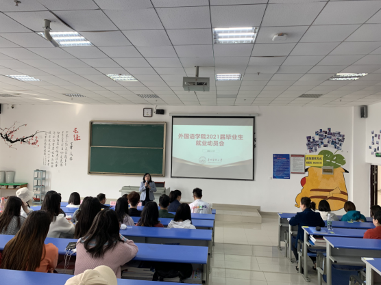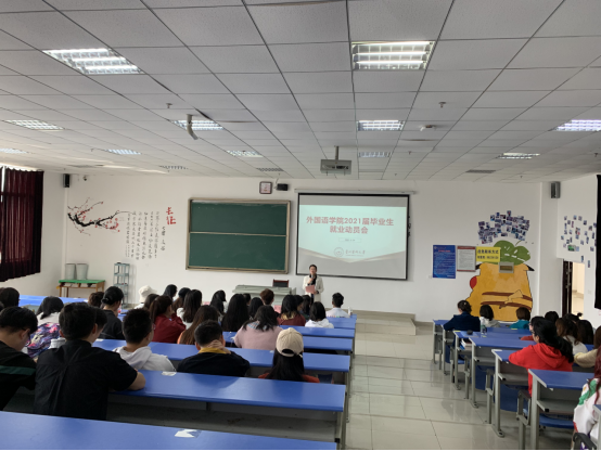 为引导毕业生更好的树立正确的择业观与就业观,进一步了解当前严峻的就业形势、明确就业方向,公司于2021年3月19日在南校区1402教室召开2021届毕业生就业动员大会。出席会议的有公司党委书记张婷婷、经理龙芸、副书记马琳娜、副经理冉海勇、招就处张洁、张迪老师以及翻译系主任曾天骄老师、毕业班辅导员黎文清,副书记马琳娜主持会议。