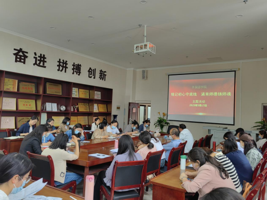为深入贯彻落实党的二十大精神,认真学习贯彻习近平总书记关于教育的重要论述,特别是关于师德师风建设的重要指示批示精神,5月17日哈哈体育在南校区组织开展了主题为“铭记初心守底线,涵育师德铸师魂”主题活动,全院教职工参加,活动由冉海勇副经理主持。