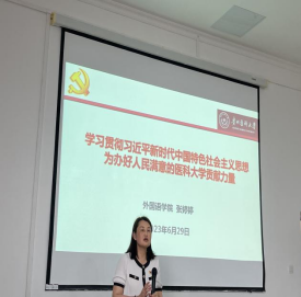 张婷婷以《学习贯彻习近平新时代中国特色社会主义思想 为办好人民满意的医科大学贡献力量》为题,围绕“学思想,强党性”“用习近平新时代中国特色社会主义思想武装头脑、指导实践”“坚持以习近平新时代中国特色社会主义思想为指导,优化大学英语教学、助力学校人才培养,为办好人民满意的医科大学贡献力量”三个部分,以“浦江经验”和“千万工程”的重要启示结合学院工作实际,对公司党员干部的理论学习、党性锻炼、实践推动发展方面进行了阐述。